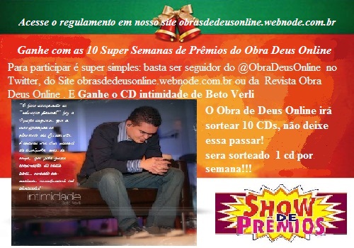 Promoção 10 Super Semanas de Prêmios do Obra Deus Online e Ganhe CDs intimidade de Beto Verli.